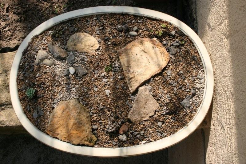 Ach ja, bevor ich viele meiner Sorten endlich auspflanzen konnte hatte ich sie alle in Töpfen stehen (im Winter vorsichtig sein: Es darf kein Wasser darin stehen und gefrieren). Vor ein paar Tagen habe ich BOnsaischalen geschenkt bekommen und sie mit einigen kleinwüchsigne Sorten beflanzt, dabei auch Delosperma und andere Sukkulenten. Z.B. diese hier:
