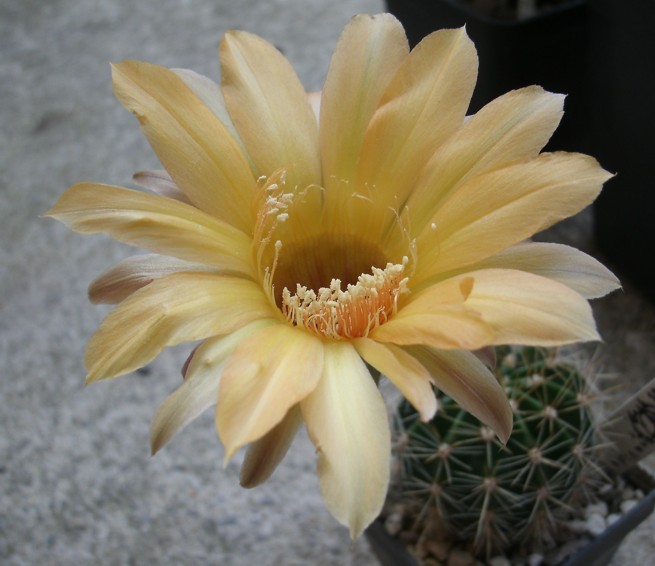 Ich habe sie mit einer Pseudolobivia , die etwas dunkere Farbtöne hat, weiter gekreuzt. Da düfte was gutes bei heraus kommen. Der Körper wirt dann Pseudolobivia Form.