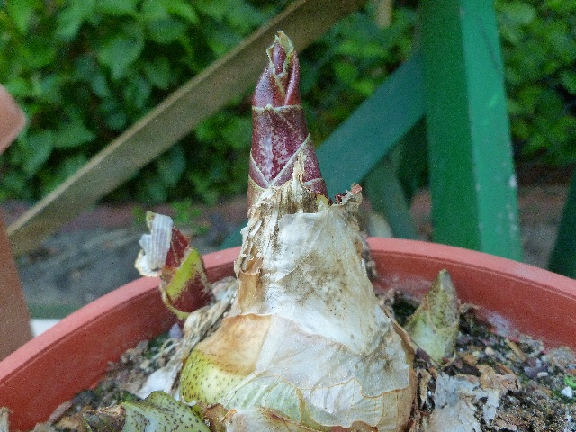 Während die Mutterzwiebel, gekauft 2008, noch ihr Laub trägt, schiebt die Tochterzwiebel, welche sich 2012 gebildet hat und die ich im Frühjahr von der Basis abgetrennt habe, bereits eine Knospe: