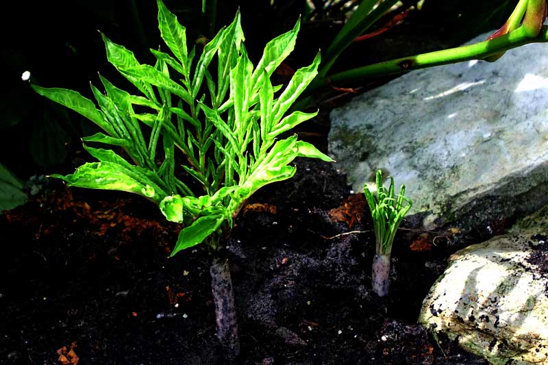 Amorphophallus und Typhonium habe ich dieses Jahr direkt draußen ausgepflanzt, langsam zeigt sich der Austrieb: