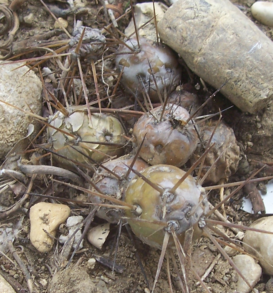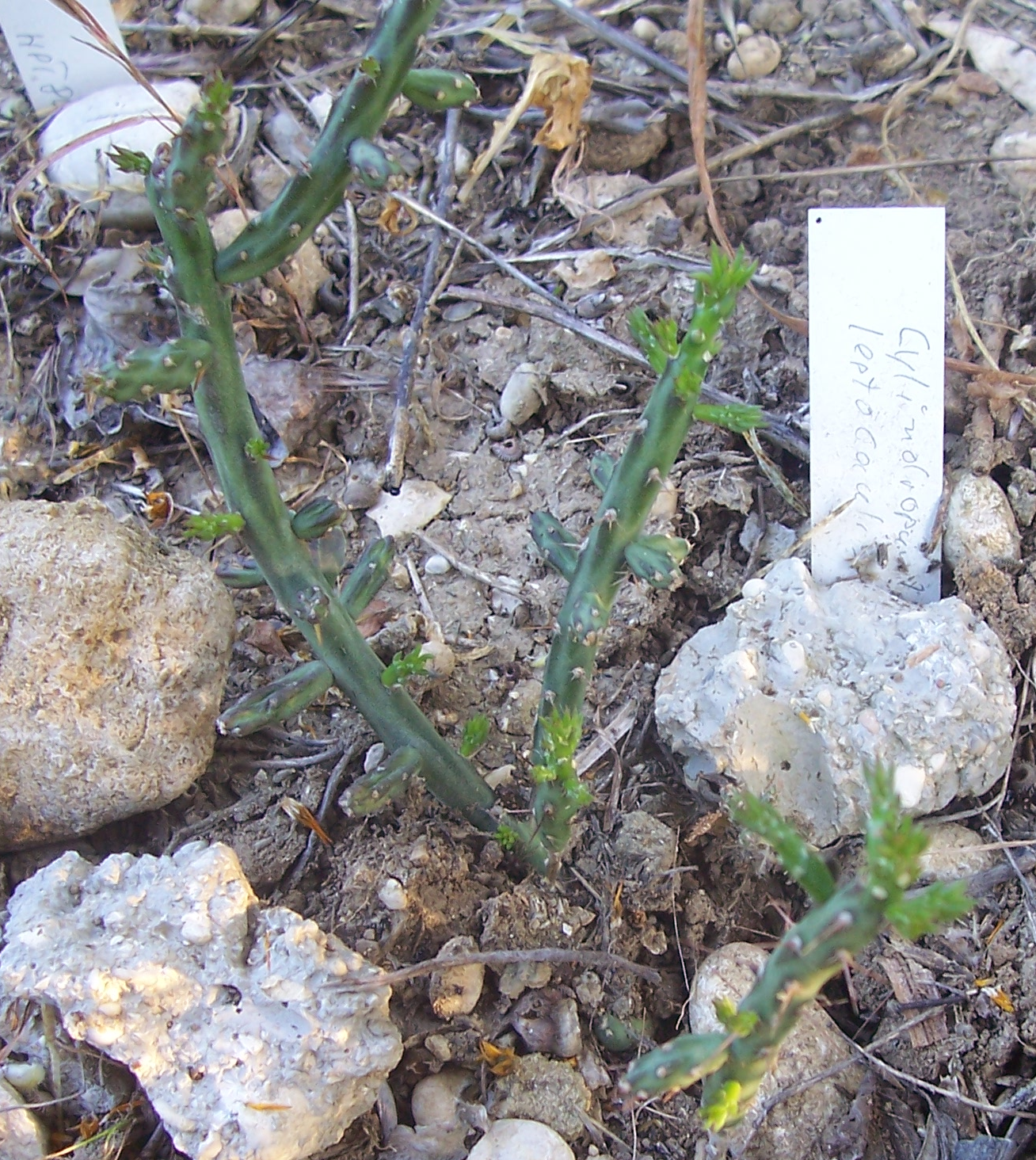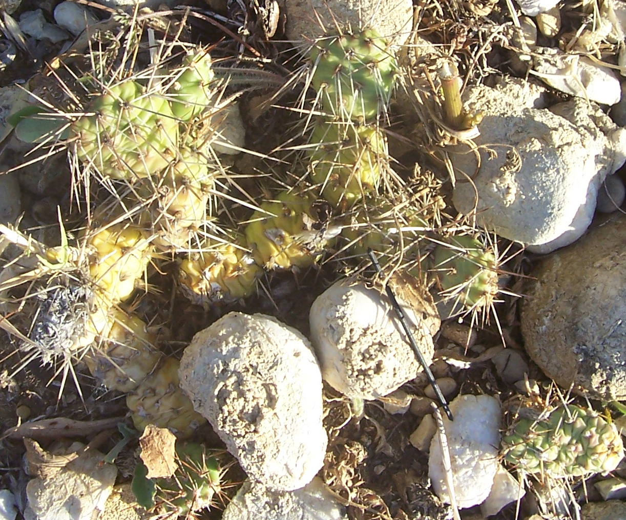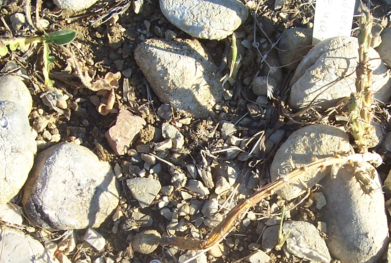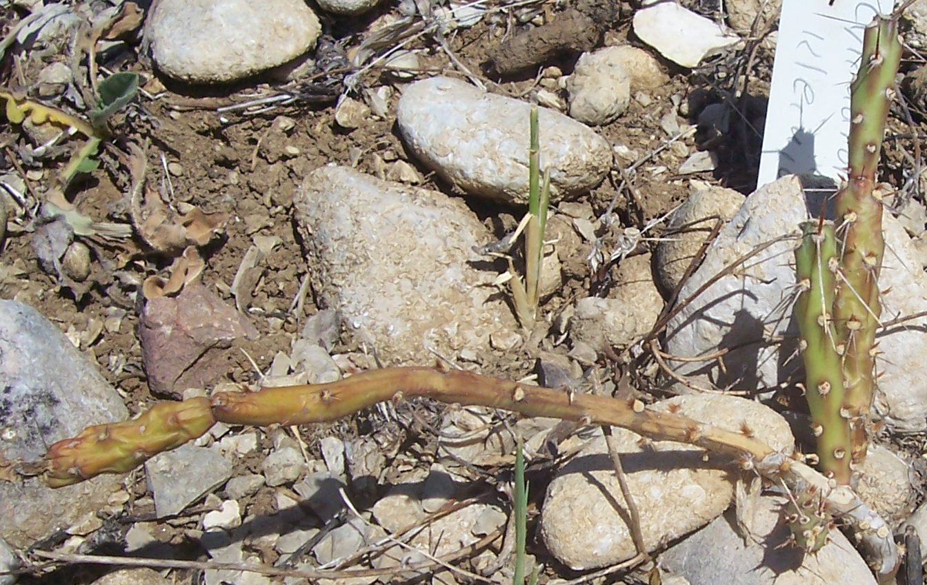 Die Stecklinge aus der Nähe. Im oberen Bildbereich ist rötlich-braun Cylindropuntia kleiniae zu sehen. Der dort vorkommende Boden ist lehmig mit vielen rundlichen Steinen verschiedener Größe. Auch Austrocylindropuntia subulata sieht gut aus und beide Stecklinge sind fest und bewurzelt obwohl sie sicherlich einige Tage unter Schnee waren, etwas das sie in unseren Breitengraden nicht vertragen.