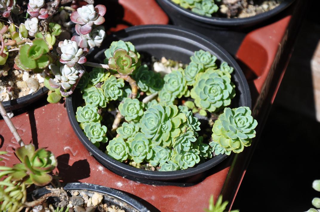 Blaugrüne Rosetten, ca 2cm Durchmesser, weiße Blüten.