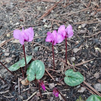 Cyclamen hederifolium (Herbstalpenveilchen), was im Herbst schon nicht wußte, ob es blühen sollte und sich jetzt für den Februar entschieden hat.
