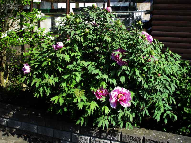 Unser momentaner Star ist wieder eine Baumpäonie: Weil wir damals nur wenig Platz hatten, haben wir uns eine Hybride ausgesucht, die laut Aussagen des Gärtners klein bleibt. Nun unsere Kleine ist mit mehr als 1,90 cm Größe ein echter Baumgeworden, der sicherlich noch größer werden würde, wenn ich nicht regelmäßig zur Schere greifen würde. Ja und klein sind die Blüten auch nicht; so ca. 25 cm im Durchmesser und haben einen Duft der wie eine Narkose wirkt.