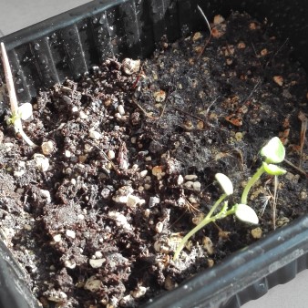 Hier ein Foto von den drei Pflanzenkindern: Das hinterste sieht übrigens wesentlich besser aus, als es das Foto zeigt. Die Keimblätter sind zwar ziemlich hin, aber ein erstes Blättchen ist schön grün und kräftig, so dass es sich hoffentlich trotz Umtopfaktion gut entwickeln wird.
