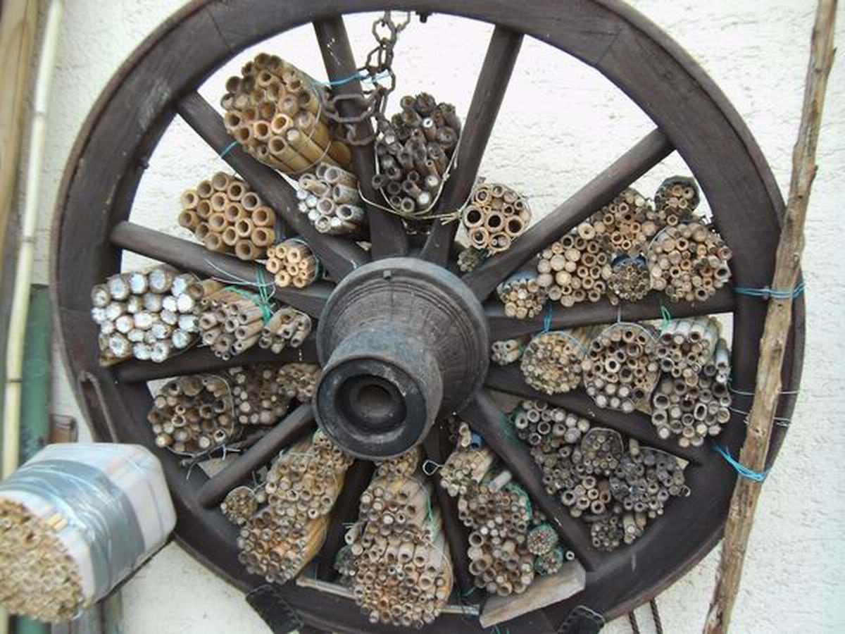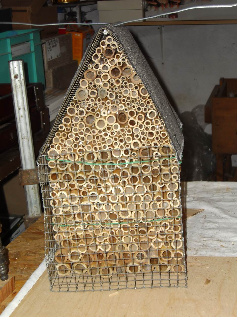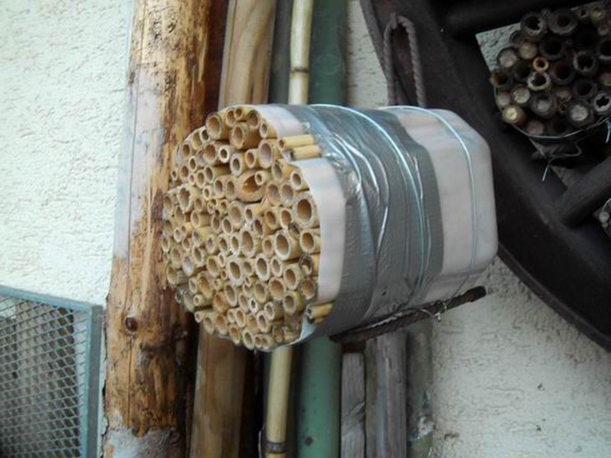 Wildbienen brauchen nur eine kleine Röhre in der die Brut und etwas Nahrung (für die werdende Larve) plaziert werden. Danach wird die Öffnung der Röhre mit Lehm oder ähnlichem Baumaterial verschlossen. Nach einigen Wochen öffnet die junge fertige Wildbiene von innen die Röhre und fliegt aus. So ein Wildbienen-Hotel kann also öfters verwendet werden.
