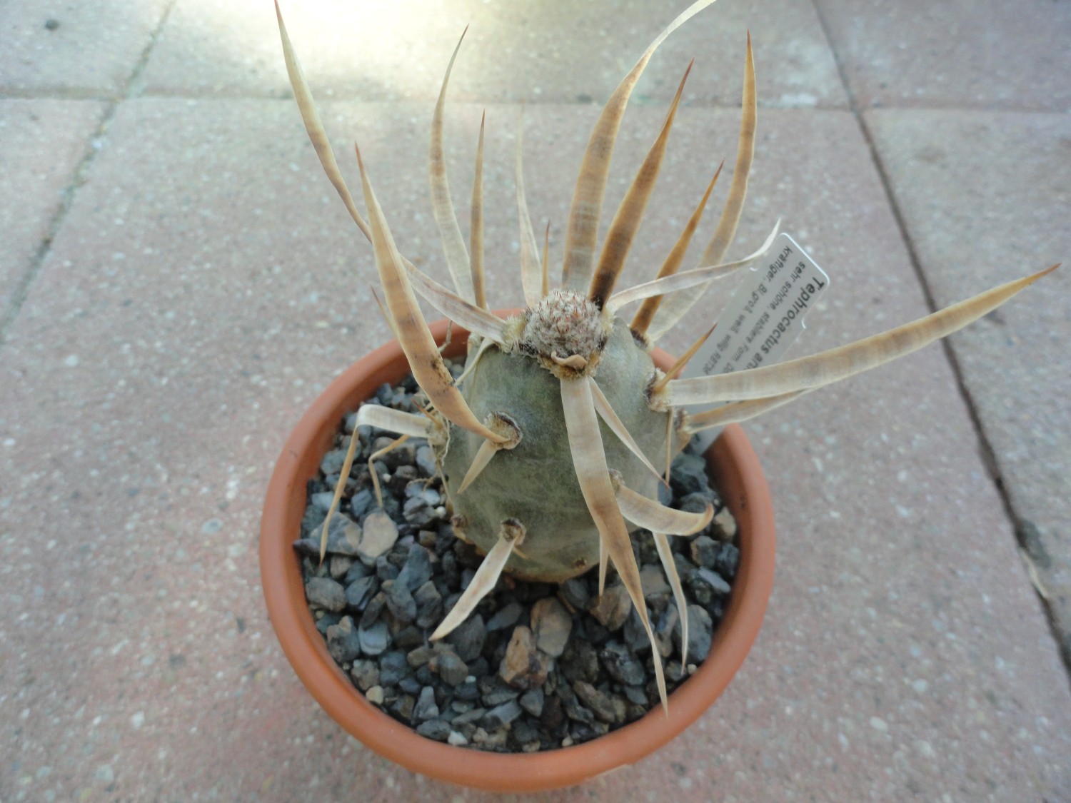 Tephrocactus articulatus ist der am meisten in unseren Sammlungen verbereitete Art...die Art ist in Argentinien auch weit verbreitet von Mendosa (San Rafael) bis La Rioja, Catamarca...sie ist zwar nicht besonders frosthart, aber -10°C hält sie ohne weiteres aus, vorgenommen sie ist vertrocknet und geschrumpft. Im Süden wäschst sie in etwa 600m...im Norden etwa 1700m und auf dieser 1000km langer Linie kann auch recht variabel sein... Die Samen sind typisch...und keimen dem entsprechend schlecht...ich habe mehrere Versuche unternommen, ohne Erfolg, aber dieses mal - ausgesäet vor einem Jahr - 2011 - NULL, dieses Jahr im März gegossen - und von etwa 100 Korn sind 18 Sämlinge gekeimt...unter diesen auch dieses Sternchen...