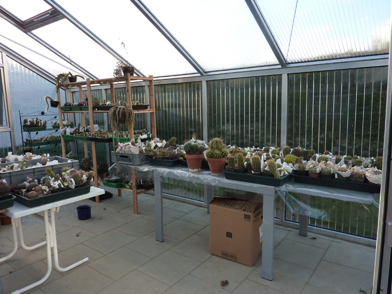 Die Tische an den Traufen wurden dann geschraubt. Ich hätte damals jeweils einen Tisch je Traufe gebaut. Aber mein Ratgeber (Schwiegervater = gelernter Schmied und alter Werkmeister im Bundesbahnausbesserungswerk) gab mir den guten Rat, diese Tische wenigsten dreigeteilt zu konstruieren. Das hätte u.a.viele Vorteile z.B wen ich das GWH mal ausräumen muss, wäre der Tisch leichter trennbar und ebenso in Einzelteilen transportierbar. Als Material verwendete ich Winkelprofil (30x30x3) Das Eindecken erfolgte sowohl mit Stegdoppelplatten als auch mit 10 mm Fassadenverkleidungsplatten. Zur Vermeidung von galvanischen Strömen habe ich übrigens nur ALU-Schrauben verwendet. Auf die Verwendung der Knotenbleche würde ich heute verzichten.