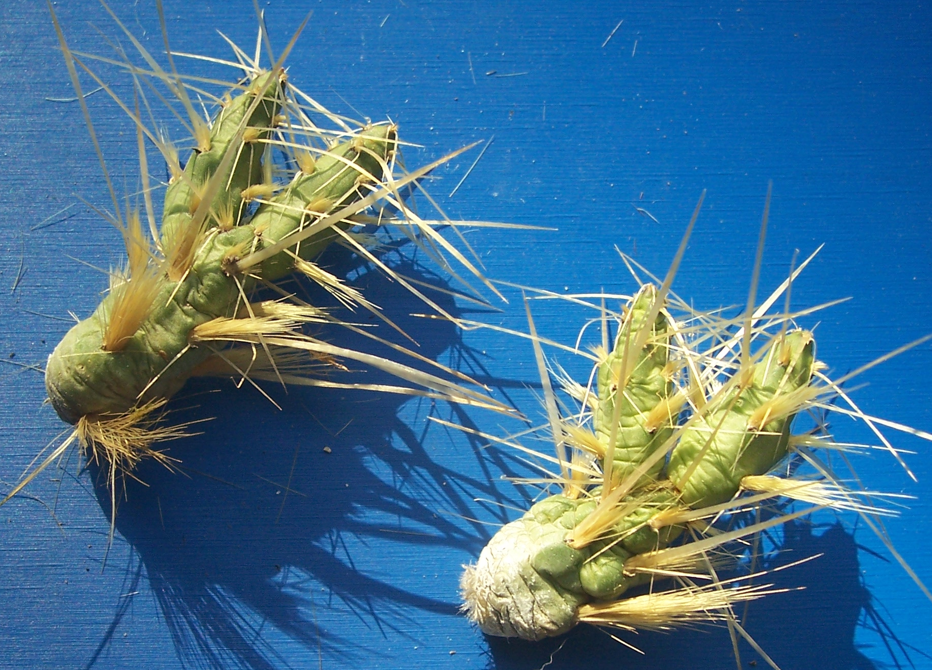 es ist so, dass die juvenilen Sprosse werden sich mit der Zeit verändern...ich beobachte es immer bei den Sämlingen, die zuerst solche "Schläuche" bilden, die nach nichts bedornt sind...erst im 2-4 Jahr beginnen sie die richtigen Sprosse bilden. Die Frage - genügend Licht ist gerecht...in der Natur wachsen sie immer ohne zudeckung von div. Pflanzen, und das heisst, dass sie auch bei uns vollsonnig stehen sollen.