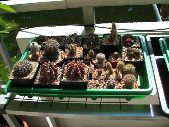 Der Balkon mit dem Winterquartier. Süd-West-Seite mit viel Sonne. Im Sommer kommt das Gewächshaus in den Keller. Dafür verteile ich Tischchen für die Kakteen. Das Regal im Hintergrund möchte ich eigentlich noch mit einer weiteren Ebene aufstocken, um die Sämlinge aus der prallen Sonne stellen zu können. Aber die Zeit muss ich ersteinmal haben.