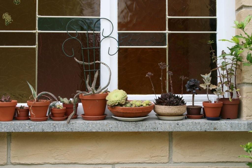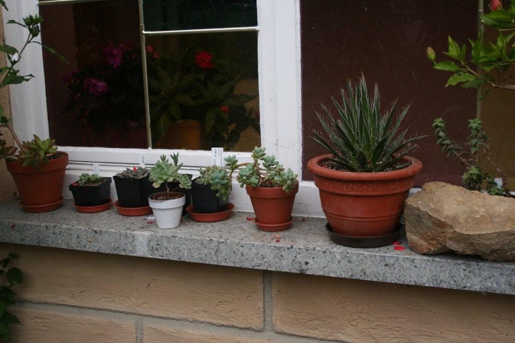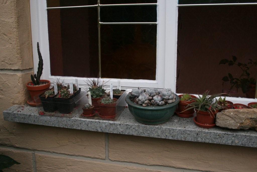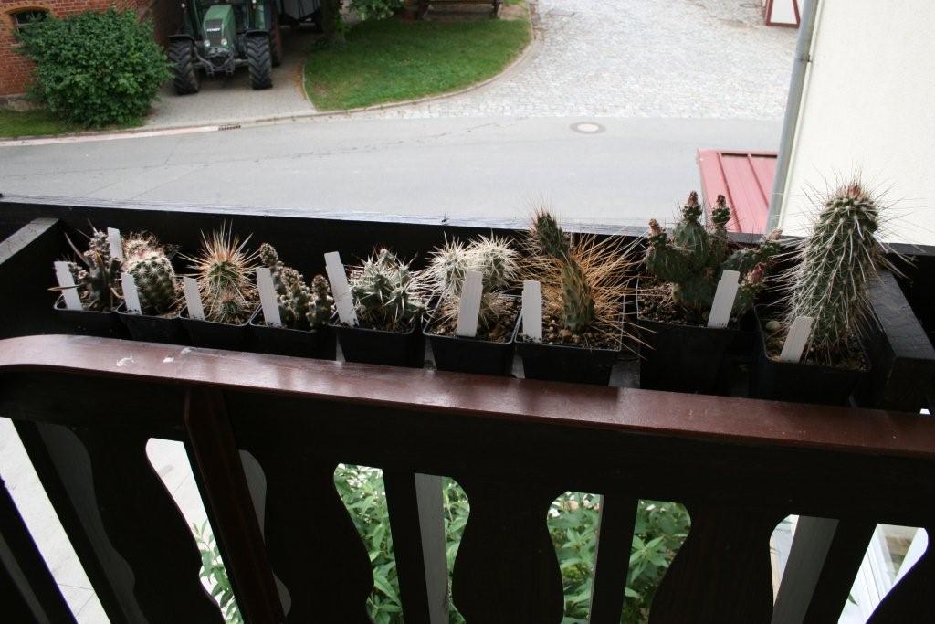 Hier Bereich 1: Balkon, vor allem Winterharte, meine ersten und sehr wenigen Blattkakteen, restliche Schätze vom Michi - wie gesagt, die Bilder sind vom letzten Jahr und ich hatte mit einigen Winterharten Pech.. bzw. war ich einfach zu doof und zu wenig da. Deshalb gibts einige von diesen tollen Pflanzen nicht mehr. :evil: