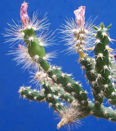 Da beide gepfropft sind haben sie längere und schwächer bestachelte Triebe und wachsen auch schneller als Pflanzen auf eigenen Wurzeln. Meine Micropuntia gracicylindrica blüht bereits als kleiner Pröpfling und sehr zuverlässlich jedes Jahr. Selbstbestäubung hat leider nicht funktioniert.